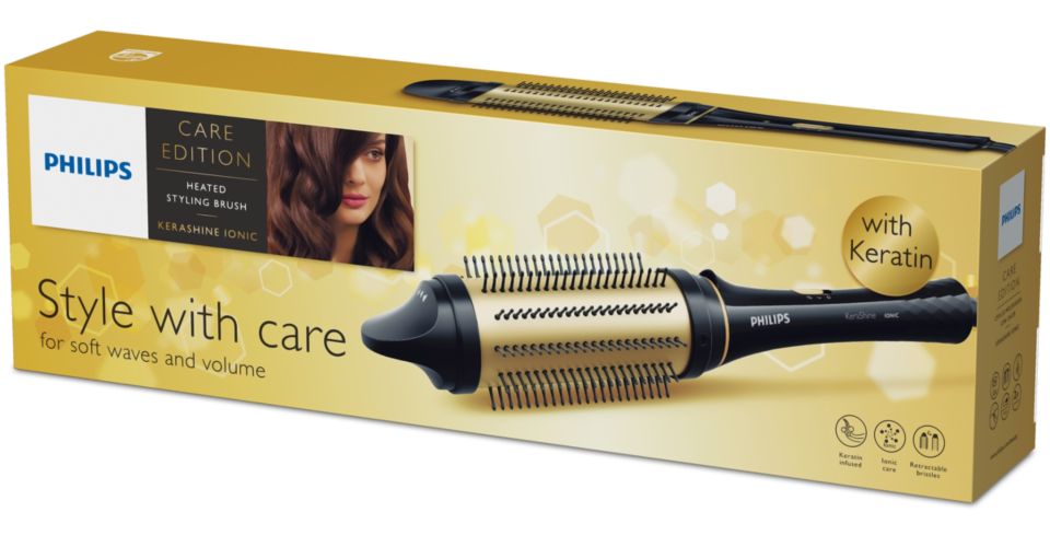 Heated 45mm barrel with Keratin coating secures long lasting results, and retractable bristles guarantee safe application.